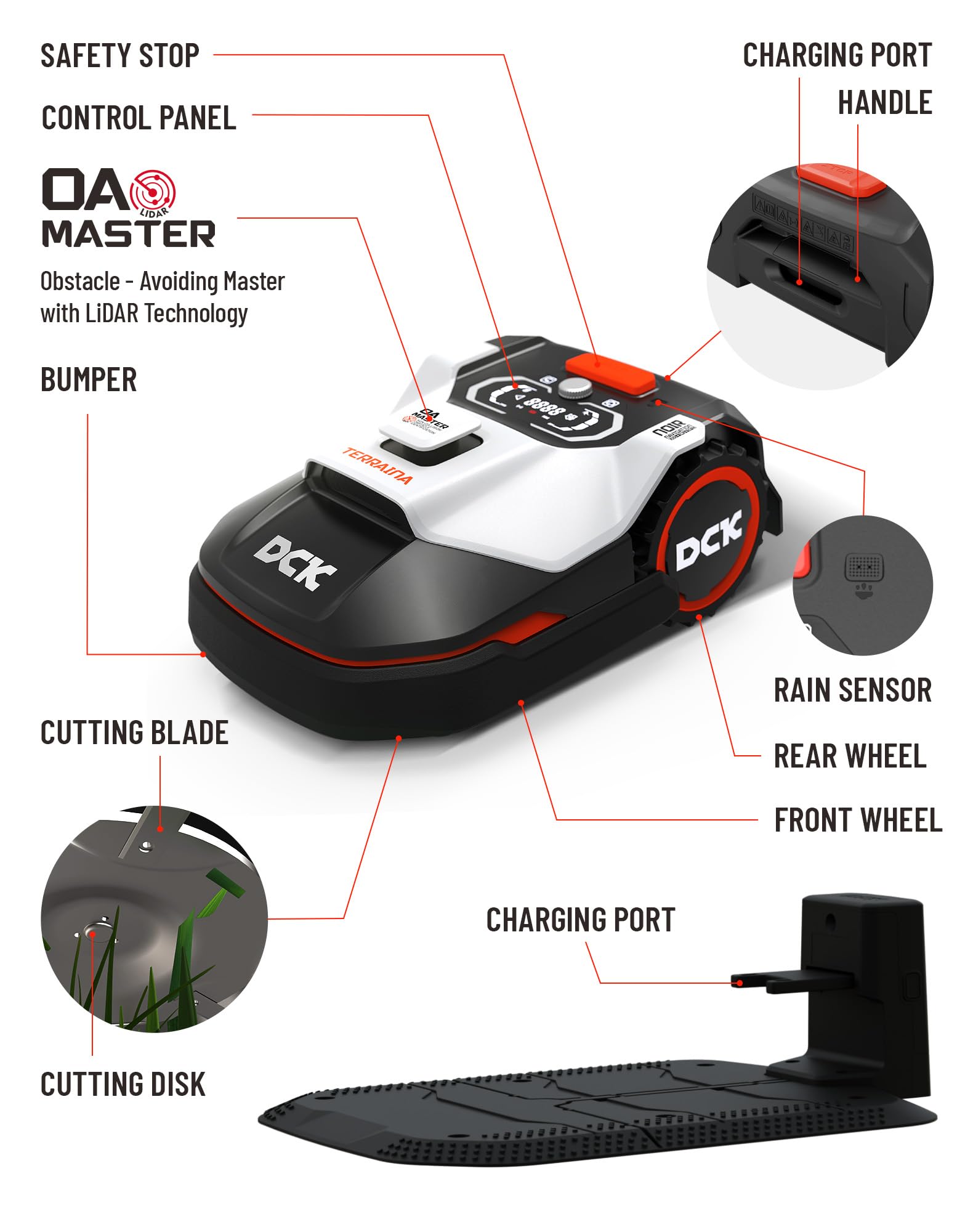 - Doppelte Sicherheit-Vorausschauende Hindernisvermeidung: DCK Rasenmäher ist mit Lidar ausgestattet,die mit einer Rate von 5000/s und einem 360°-Scan Hindernisse im Voraus erkennt und sie mit millimetergenauer Präzision umgeht.So wird sichergestellt,dass spielende Kinder oder Haustiere nicht verletzt werden.Als zusätzliche Sicherheitsmaßnahme sorgt die Kollisionserkennung dafür,dass die Maschine nach einer Kollision mit einem kleinen Gegenstand ausweicht und so einen nachhaltigen Kontakt und Maschinenschäden verhindert.