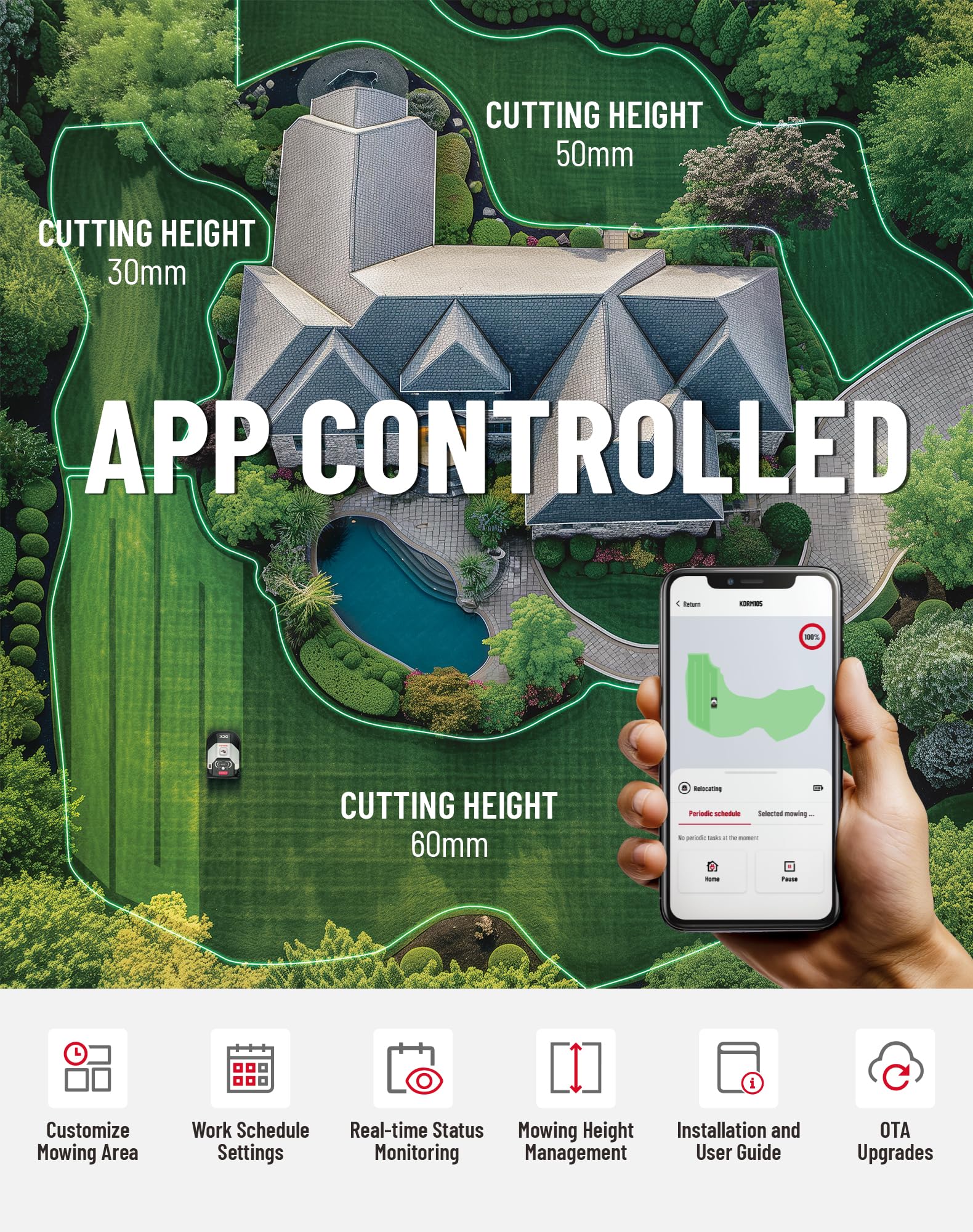 - Intelligente App-Steuerung:Einstellung des Zeitplans im Voraus: Stellen Sie den Mähplan in der App ein, Sie können den Mähstatus über Ihr Mobiltelefon überprüfen, auch wenn Sie im Urlaub sind, und Ihren Rasen zu Hause leicht verwalten. Intelligente Einstellungsparameter: Stellen Sie die Schnitthöhe frei über die App ein, 30-60mm, einfach und bequem zu bedienen, keine Notwendigkeit, zur Seite des Roboters zu laufen, um einzustellen, effizienter."