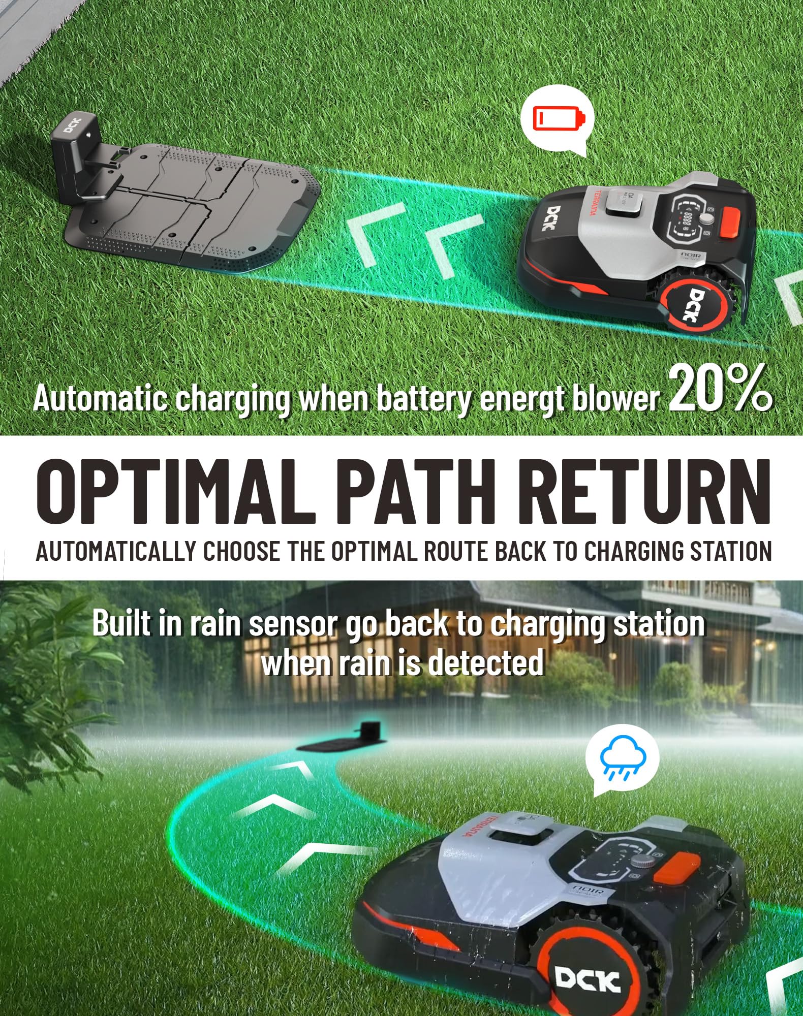 - Optimaler Rückweg: Im Gegensatz zu anderen Robotern, die entlang der Begrenzungslinie zurückkehren, kann der DCK Rasenroboter automatisch den optimalen Rückweg zur Ladestation berechnen, ohne dass eine Führungslinie erforderlich ist, was sowohl Zeit als auch Energie spart, die Nutzung der Batterien maximiert und die Arbeitseffizienz verbessert.